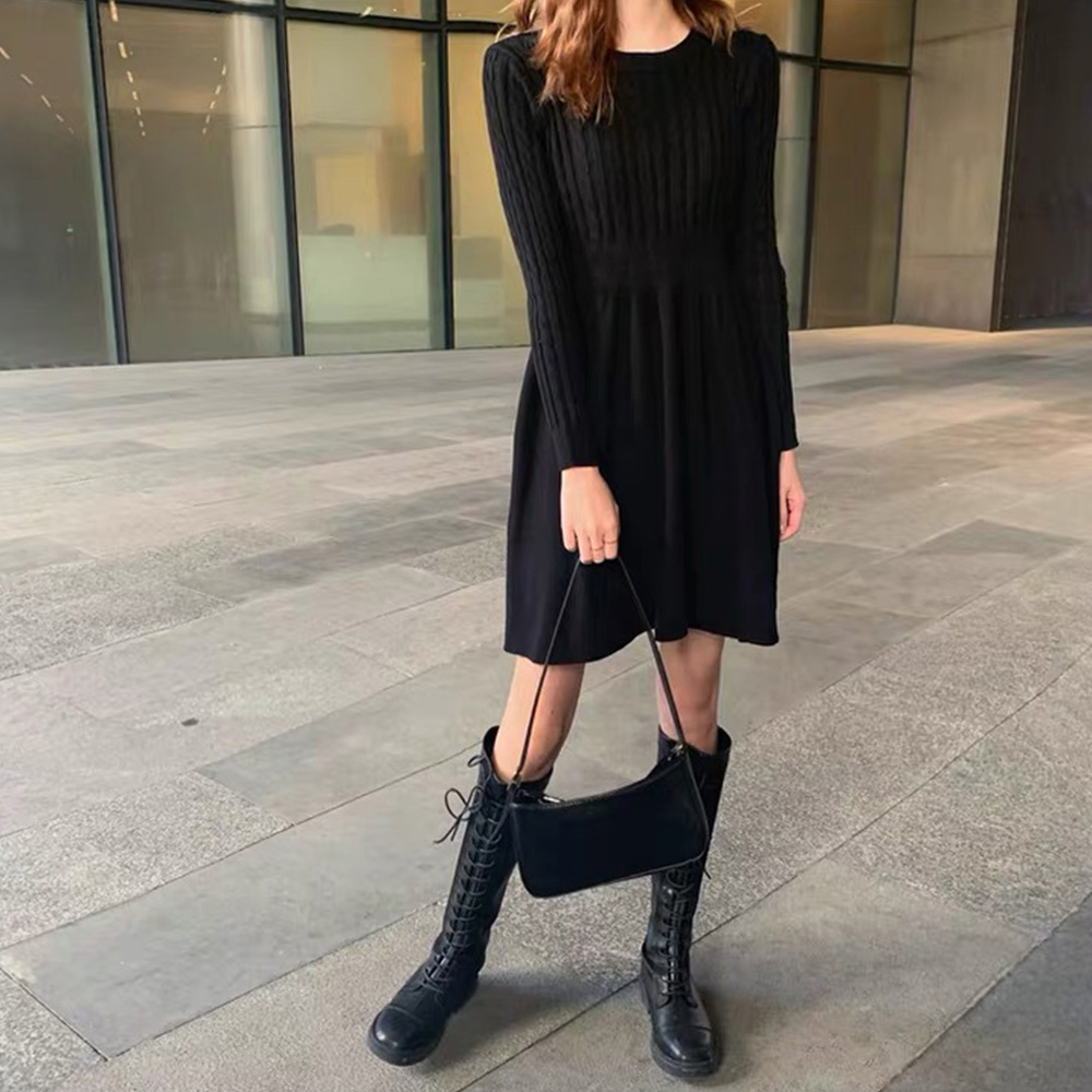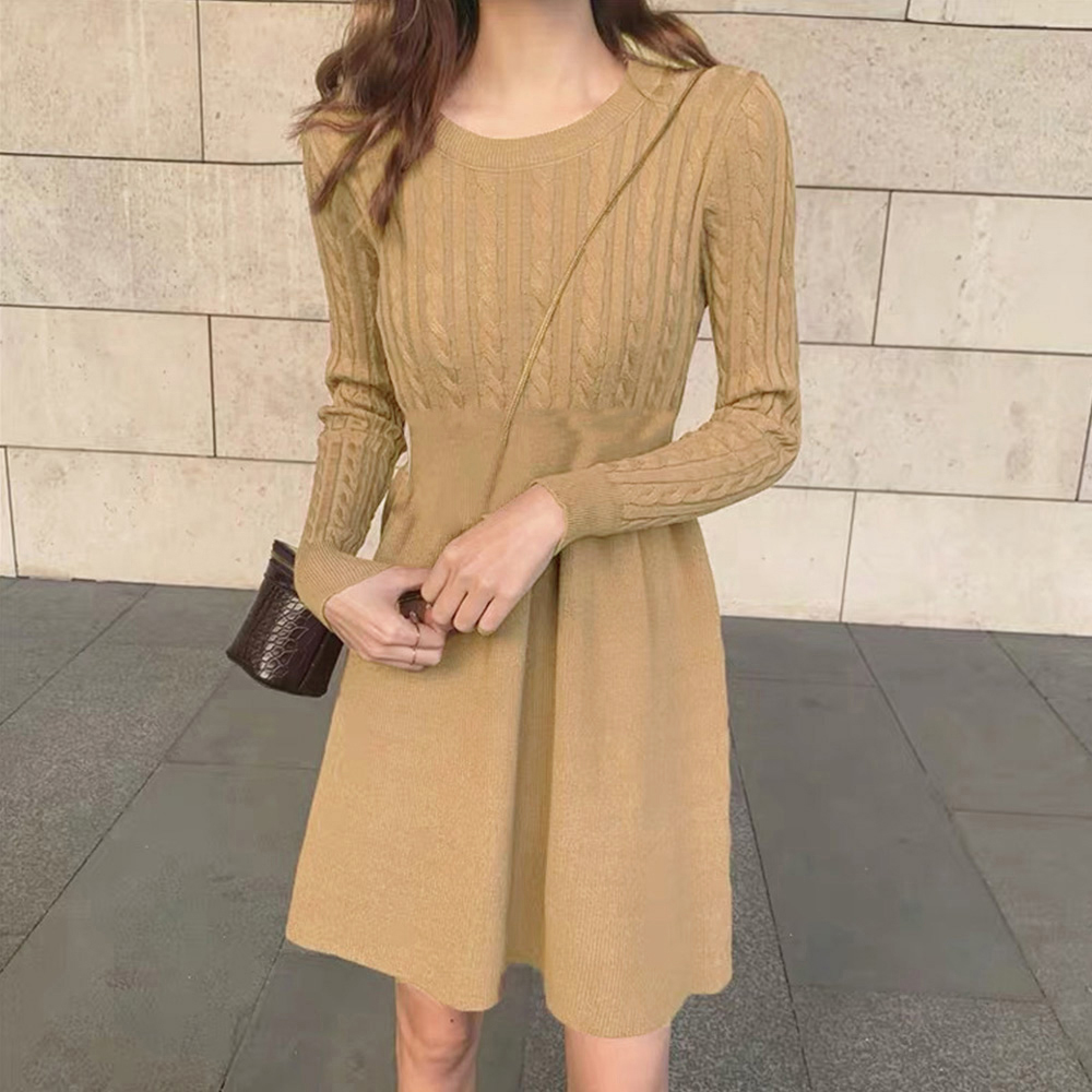 ウエストマーク Aラインワンピース 通勤通学 フレアワンピース シンプル ハイウエスト 長袖 膝上丈ワンピース 秋冬無地